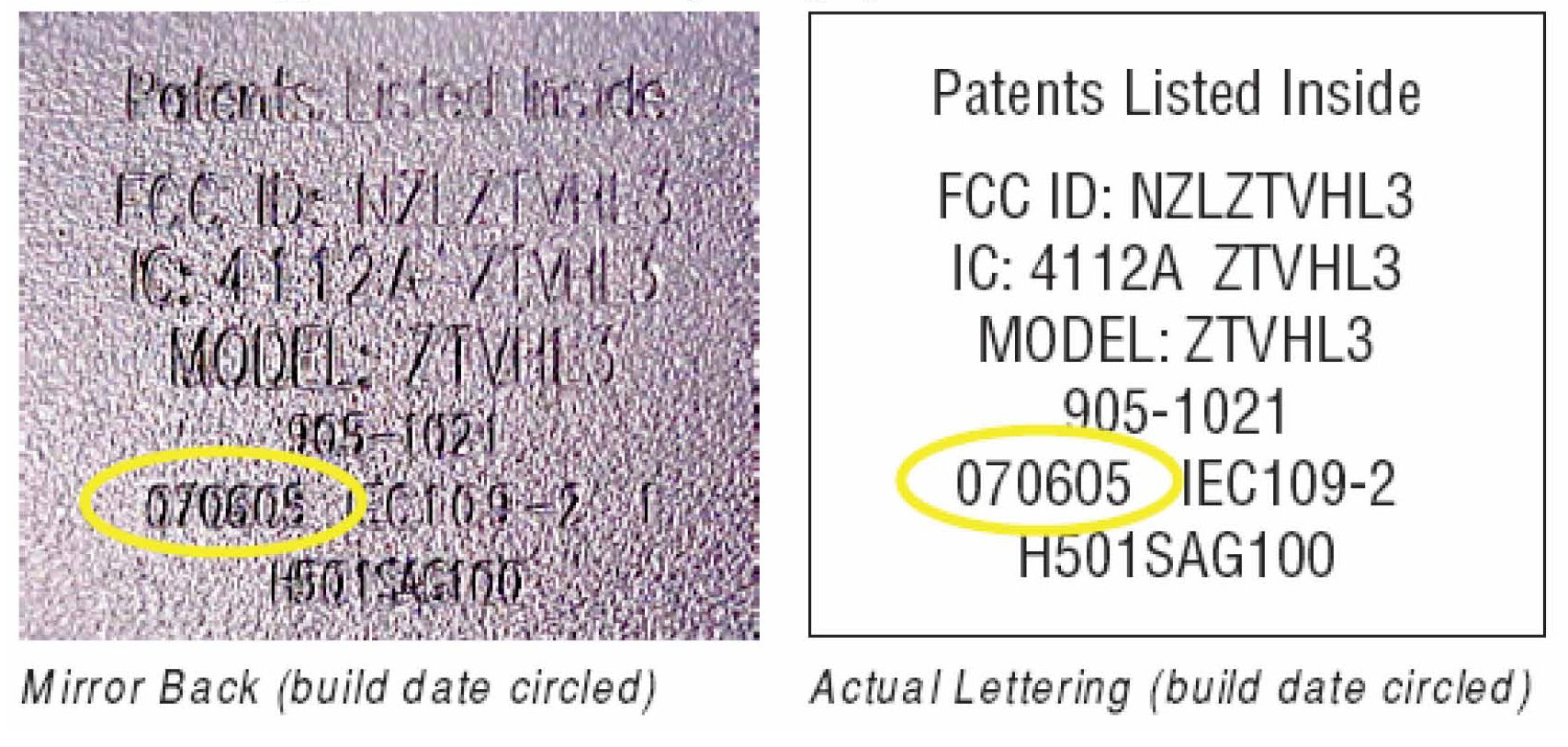 Auto-dimming Compass Mirror (P.N. H501SAG100)If you should encounter an Auto-dimming Compass Mirror (P.N. H50TSAGT00), which is not functioning properly, please check the factory build date on the back of the mirror (see pictures, below). If the build date is 070605, 070705, or 070805 please replace the mirror. This mirror is applicable to B9 Tribeca, & Legacy/Outback.