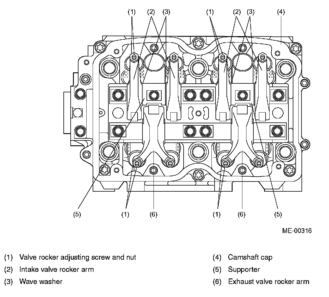 Valve Rocker Assembly- The intake valve rocker arms and the exhaust valve rocker arms are installed on their own rocker shafts both of which are retained by the camshaft caps.