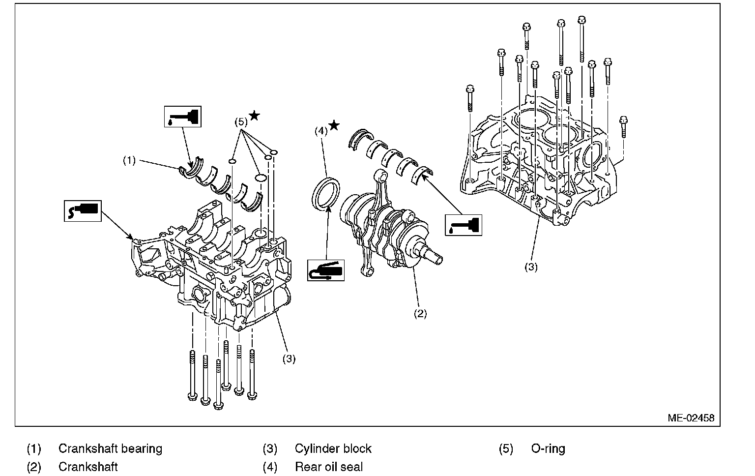 NOTE: Remove oil on the mating surface of bearing and cylinder block before installation. Apply a coat of engine oil to crankshaft pins.