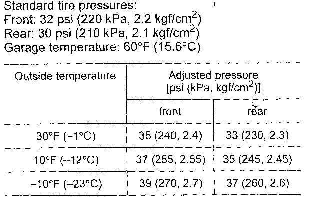 If you adjust the tire pressures in a warm garage and will then drive the vehicle in cold outside air, the resulting drop in tire pressures may cause the low tire pressure warning light to come on. To avoid this problem when adjusting the tire pressures in a warm garage, inflate the tires to pressures higher than those shown on the tire placard. Specifically, inflate them by an extra 1 psi (6.9 kPa, for every difference of 10°F (5.6°C) between the temperature in the garage and the temperature outside. By way of example the following table shows the required tire pressures that correspond to various outside temperatures when the temperature in the garage is 60°F (15.6°C).