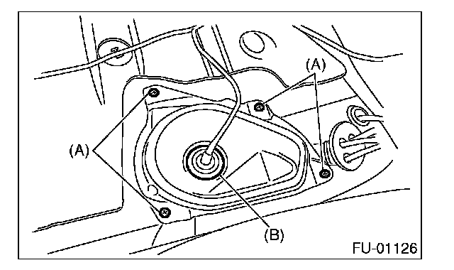 2. Push the grommet (B) down under the body and remove the service hole cover.