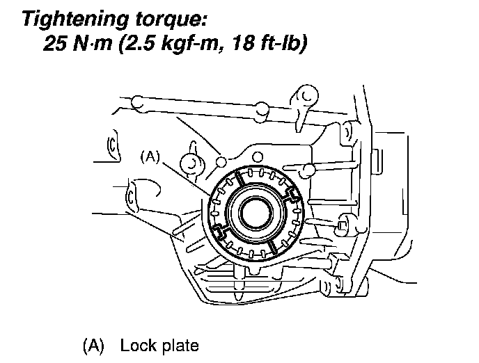 6. If tooth contact is correct, mark the retainer position and loosen it. After fitting a new O-ring and oil seal, screw in the retainer to the marked position. Tighten the lock plate with specified torque.