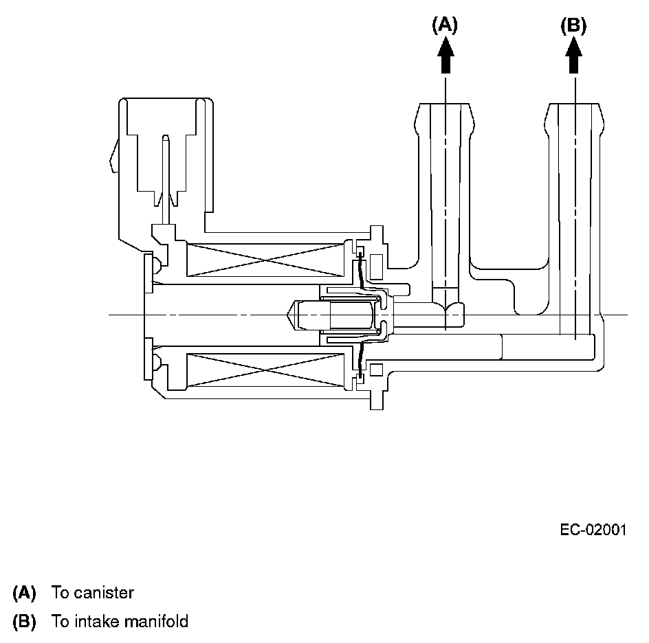 PURGE CONTROL SOLENOID VALVEThe purge control solenoid valve is on the evaporation line between the canister and intake manifold. The valve is installed under the intake manifold and lets the evaporative gas absorbed by the canister be drawn into the intake manifold.