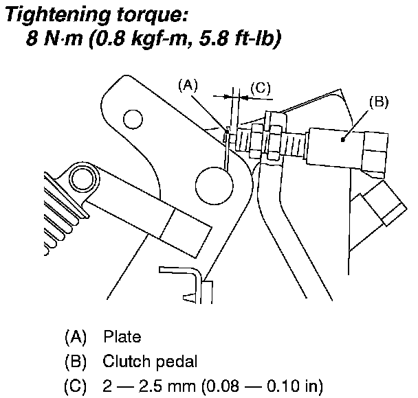 2. Install the clutch pedal plate and clutch pedal so that the gap between them is 2 - 2.5 mm (0.08 - 0.10 inch), and then tighten the lock nut.