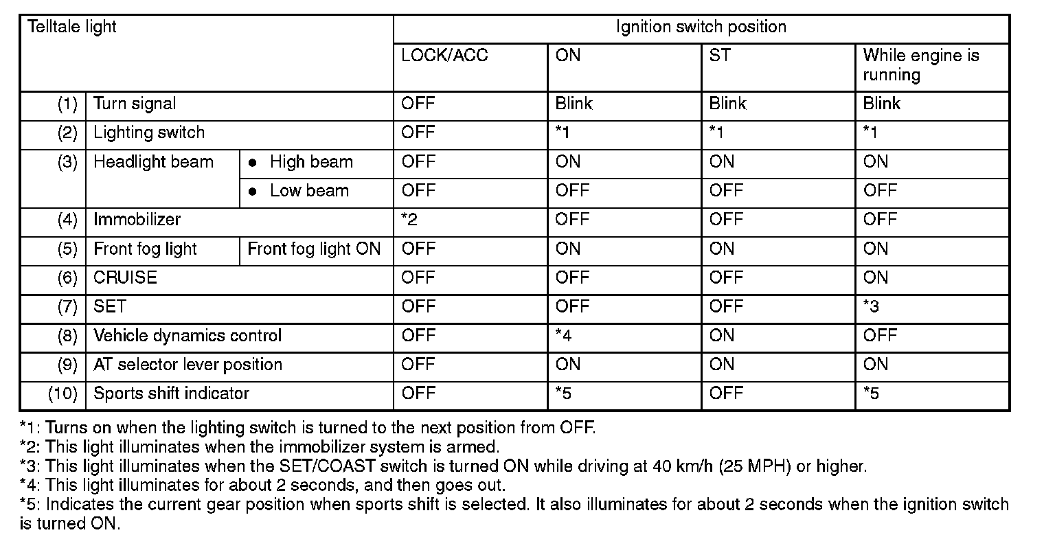 When everything is normal, the telltales should be ON, OFF or in other states as shown in the table according to ignition switch position.