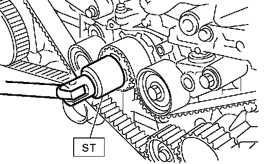 Using white paint, put alignment marks or arrow marks on the timing belts in relation to the crank sprocket and cam sprockets.