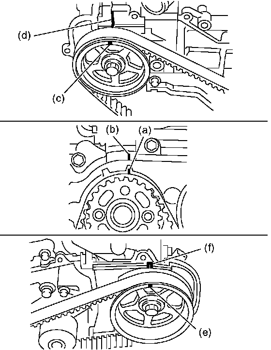 To turn crankshaft, use the ST: Align the mark (a) of sprocket to the cylinder block notch (b), and then ensure the right side cam sprocket mark (C), cam cap and cylinder head matching surface (d) or left side cam sprocket mark (e), timing belt cover notch (f) are properly adjusted.
