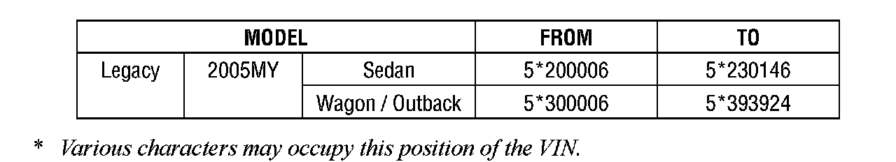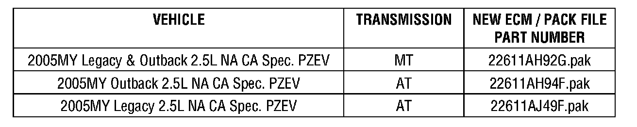 2005 MY Subaru Legacy and Outback with CAL PZEV Spec Emission System and motor vehicle registration in the States of California, Massachusetts, Maine, New York or Vermont only.