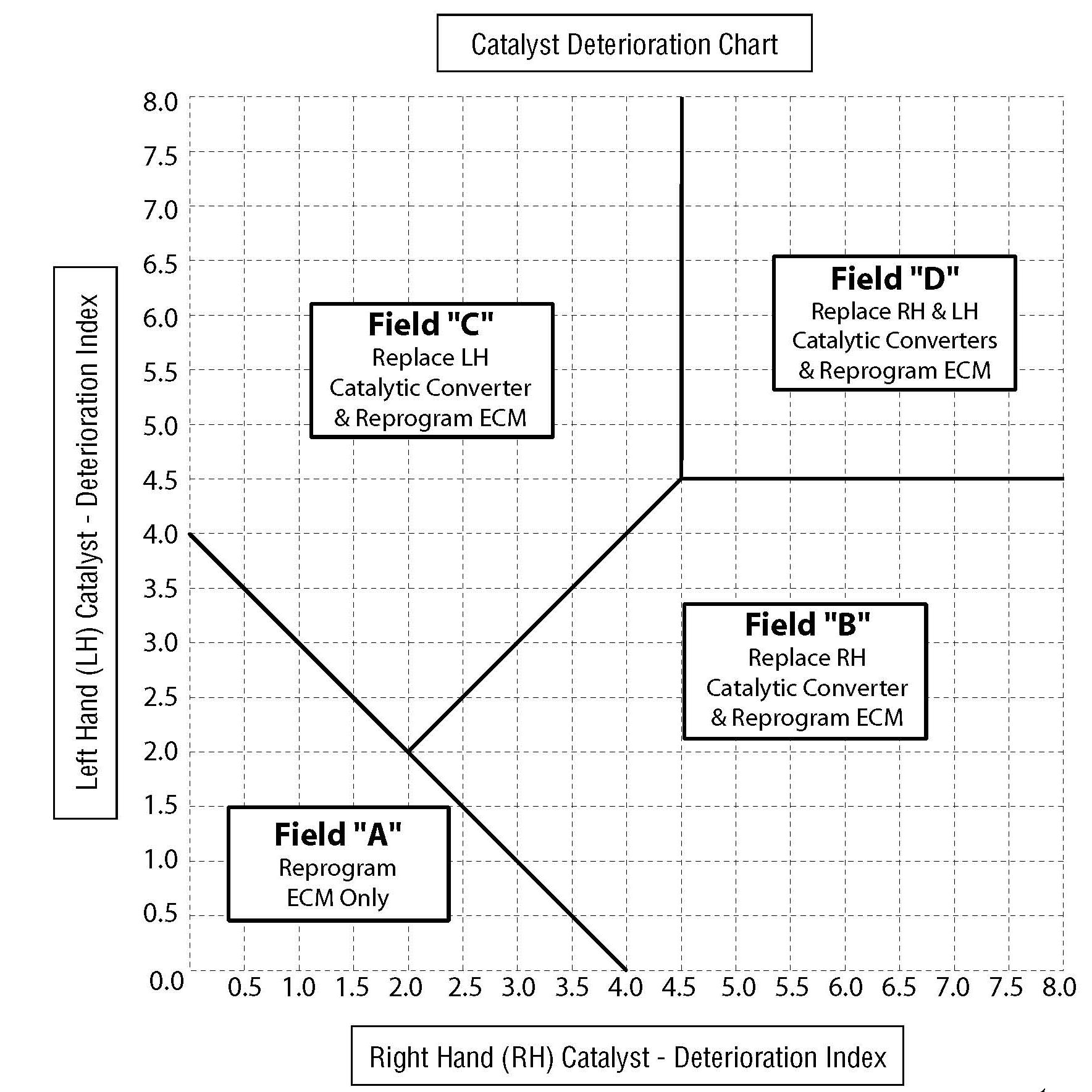 Plot the intersection of the RH and LH deterioration indexes in the appropriate position of the following Catalyst Deterioration Chart. Determine the correct repair procedure identified in the corresponding field found on the chart and proceed accordingly. In all cases, the ECM