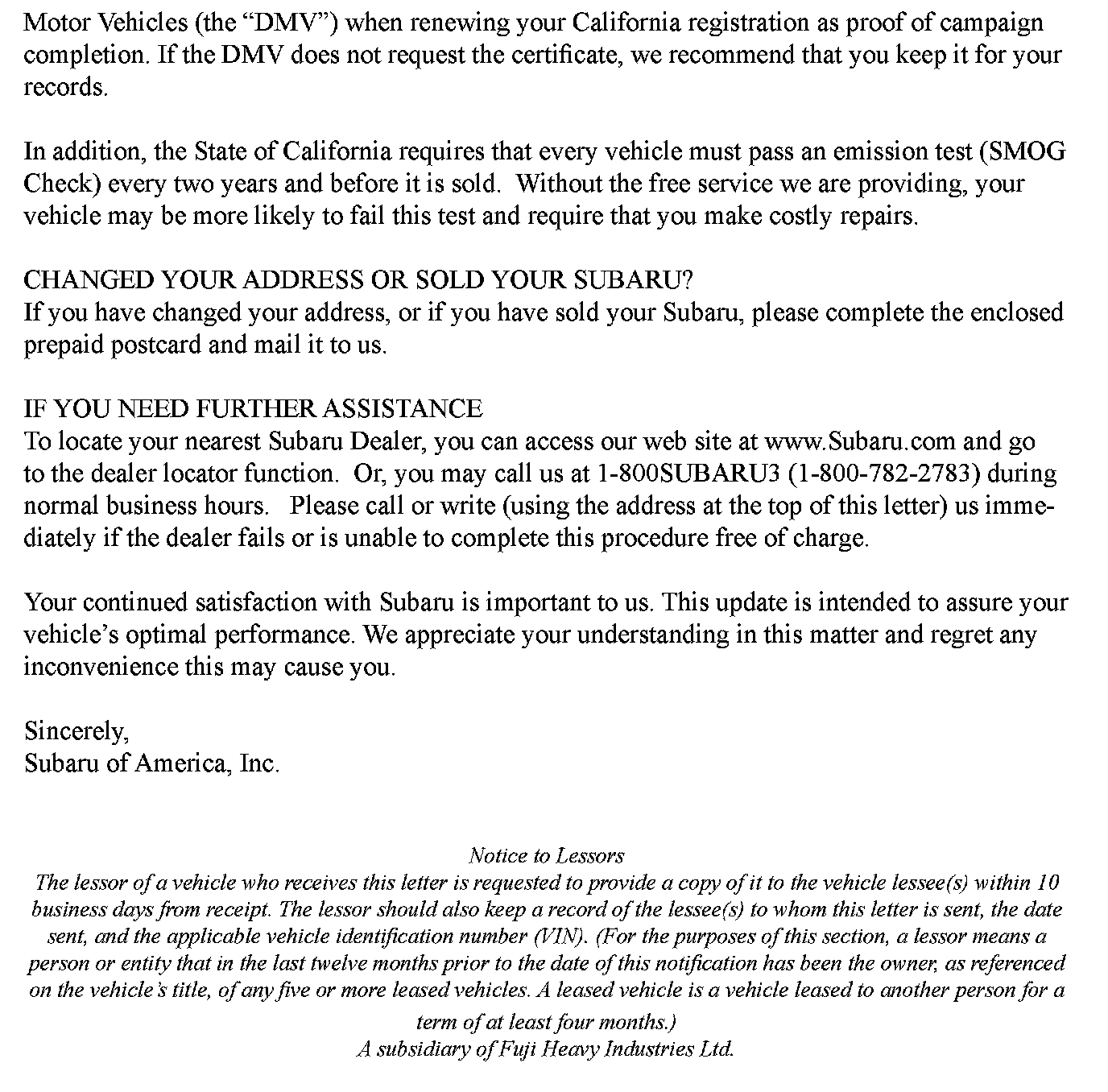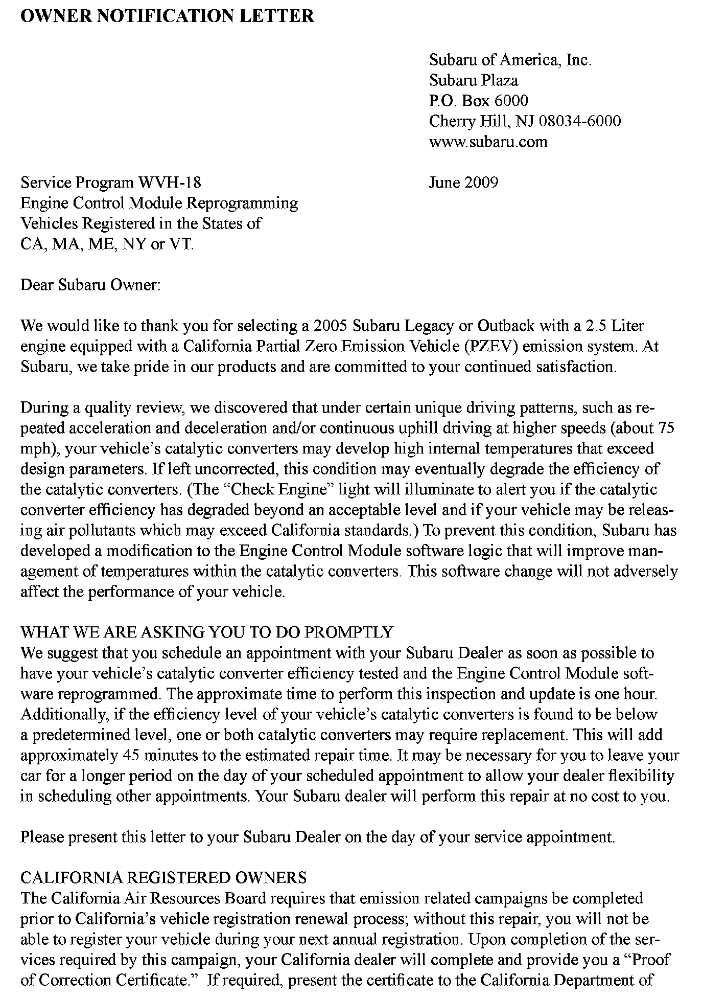 Recall - ECM Update For Catalyst Efficiency (Non-Ca.)
