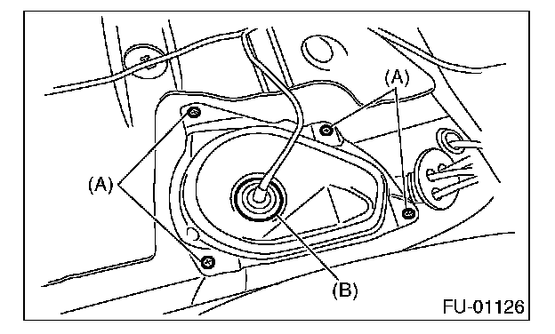 2. Push the grommet (B) down under the body and remove the service hole cover.