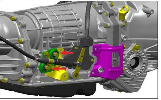 5) Install the select cable to the AT Cable Plate Assembly using the AT Cable Bracket with the 2 bolts that were retained. Install the AT Cable Plate Assembly, Cable and Bracket to the transmission using the 2 bolts that were retained.