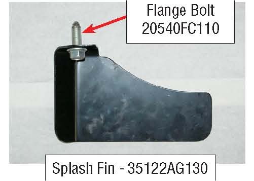 2) Install splash fin using flange bolt, make sure fin runs parallel with frame rail, torque bolt to 140 +/- 20 Nm (14.2 +/- 2.0 kgf-m, 103 +/- 14.7 ft-lb)