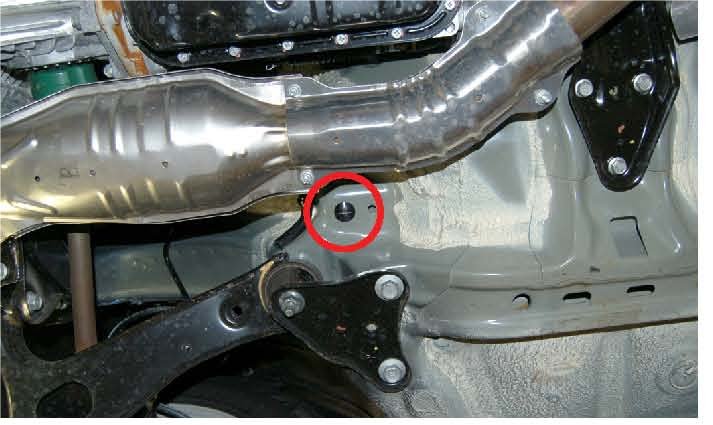 1) Remove the black plug from right side of the floor pan to gain access to the threaded hole.