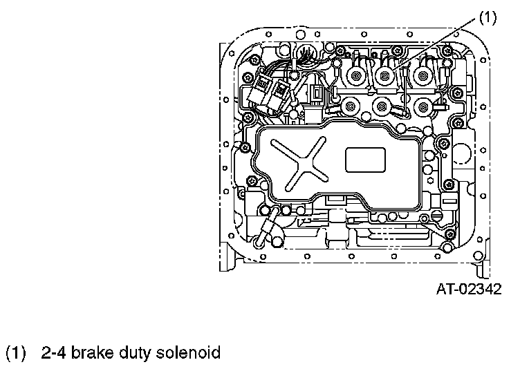 2-4 BRAKE DUTY SOLENOIDThis solenoid is mounted on the transmission control valve. This adjusts the pressure applied to the 2-4 brake in response to the duty instructions from the TCM. The engaging force of the 2-4 brake during shifting is properly controlled and shift shocks are reduced.