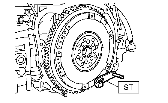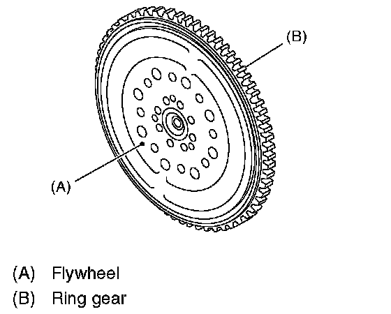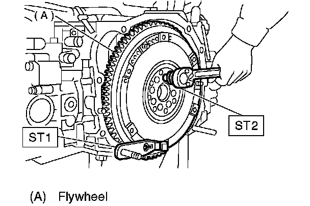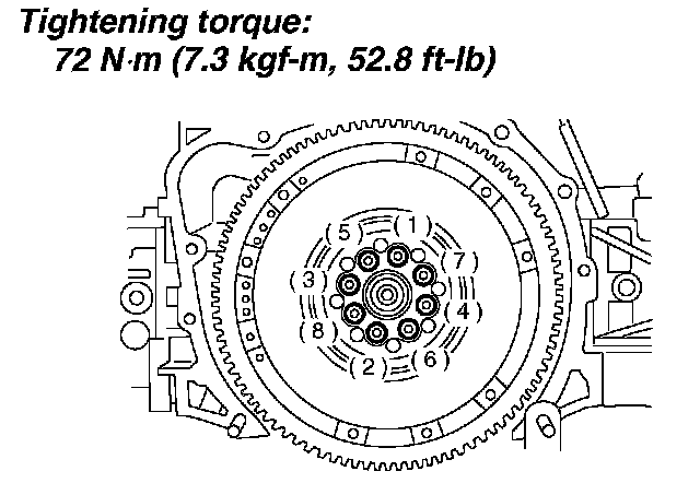 NOTE: Tighten the flywheel installing bolts gradually. Each bolt should be tightened to the specified torque in a crisscross order.