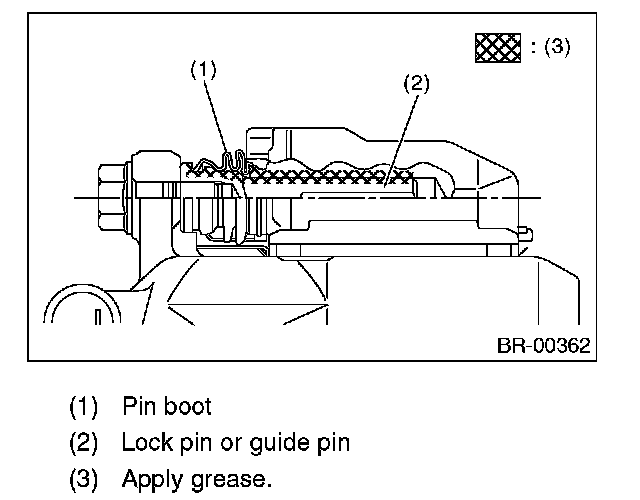 7. Apply a coat of specified grease to the guide pin, outer surface, sleeve outer surface, cylinder inner surface, and boot grooves.