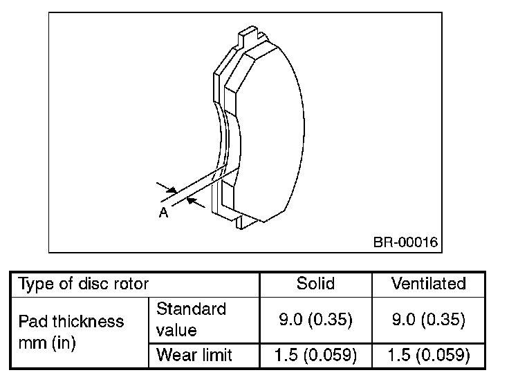^ A wear indicator is provided on the inner disc brake pad. If the pad wears down to such an extent that the end of wear indicator contacts disc rotor, a squeaking sound is produced as the wheel rotates. If this sound is heard, replace the pad.