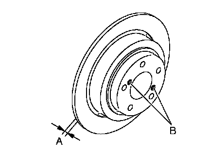 2 If the disc rotor seizes up within hub, drive the disc rotor out by pushing with an 8 mm bolt in holes B on the rotor.