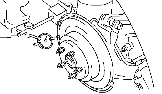 3. Set a dial gauge 10 mm (0.39 inch) inward of the rotor outer perimeter. Turn the disc rotor to check runout. If the disc rotor runout exceeds the service limit, resurface the disc rotor. After resurfacing, check disc rotor thickness as in step 4.