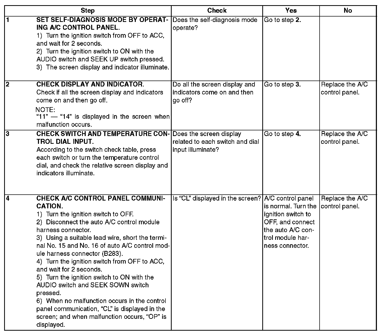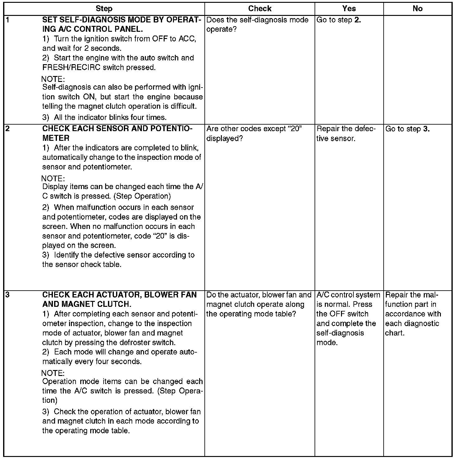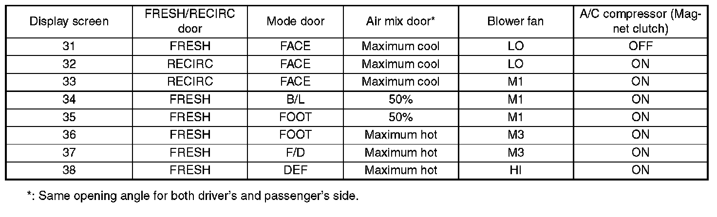 NOTE: For A/C system self-diagnosis, there is one that checks the control panel, and the other that checks the whole control system (sensor, actuator, blower motor, etc.). Perform the self-diagnosis for control panel first, and then perform the self-diagnosis for control system.