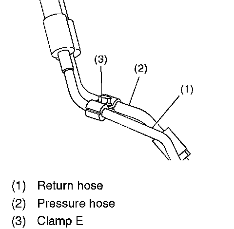 4. Remove the clamp E from return hose and pressure hose.