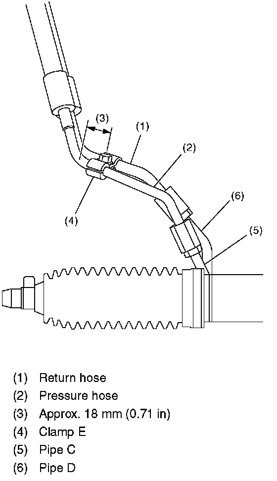 5. Temporarily connect the pressure hose and pipe C, the return hose and D. Place the clamp E in the position shown in the figure, and tighten the bolt temporarily.