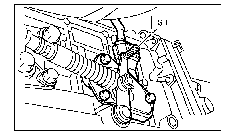 3) Insert ST (special tool) 499267300 Stopper Pin as vertical as possible into the holes in the inhibitor switch lever and switch body.