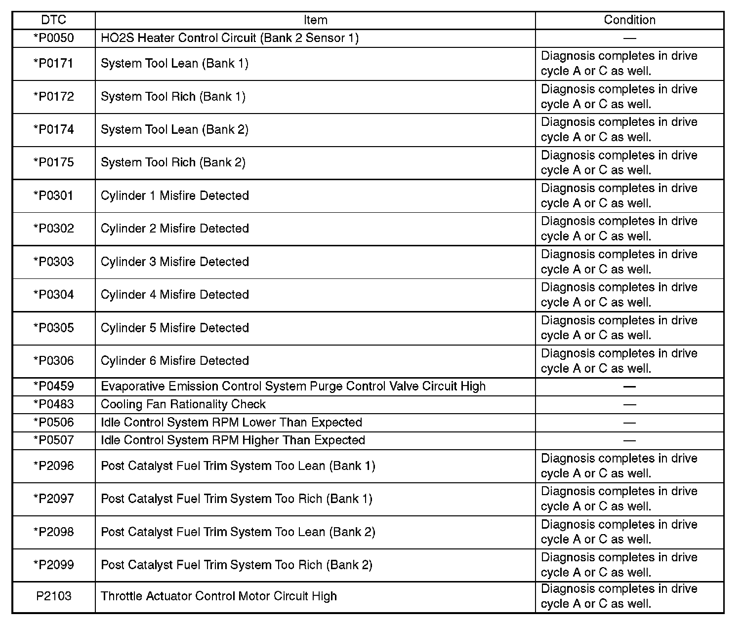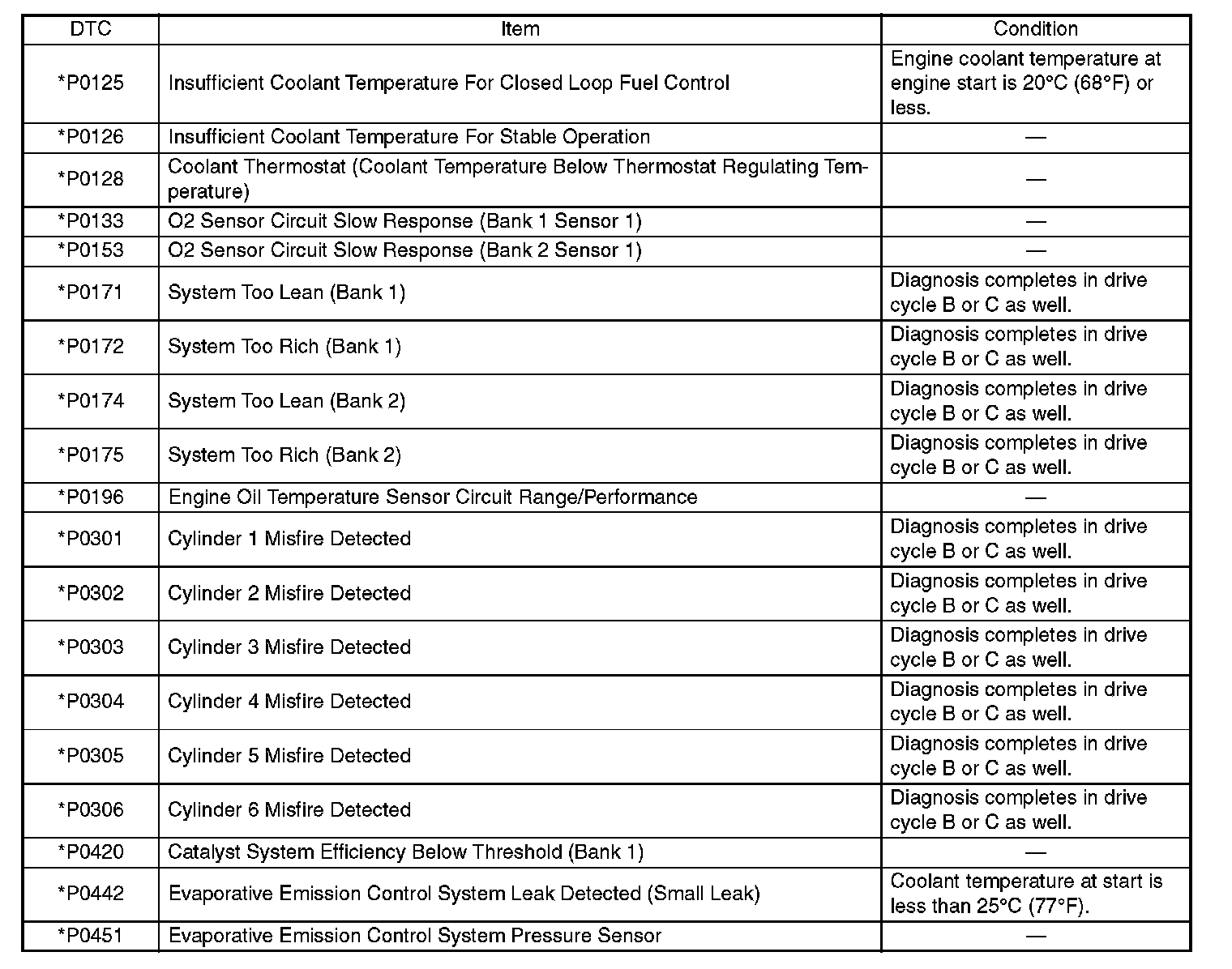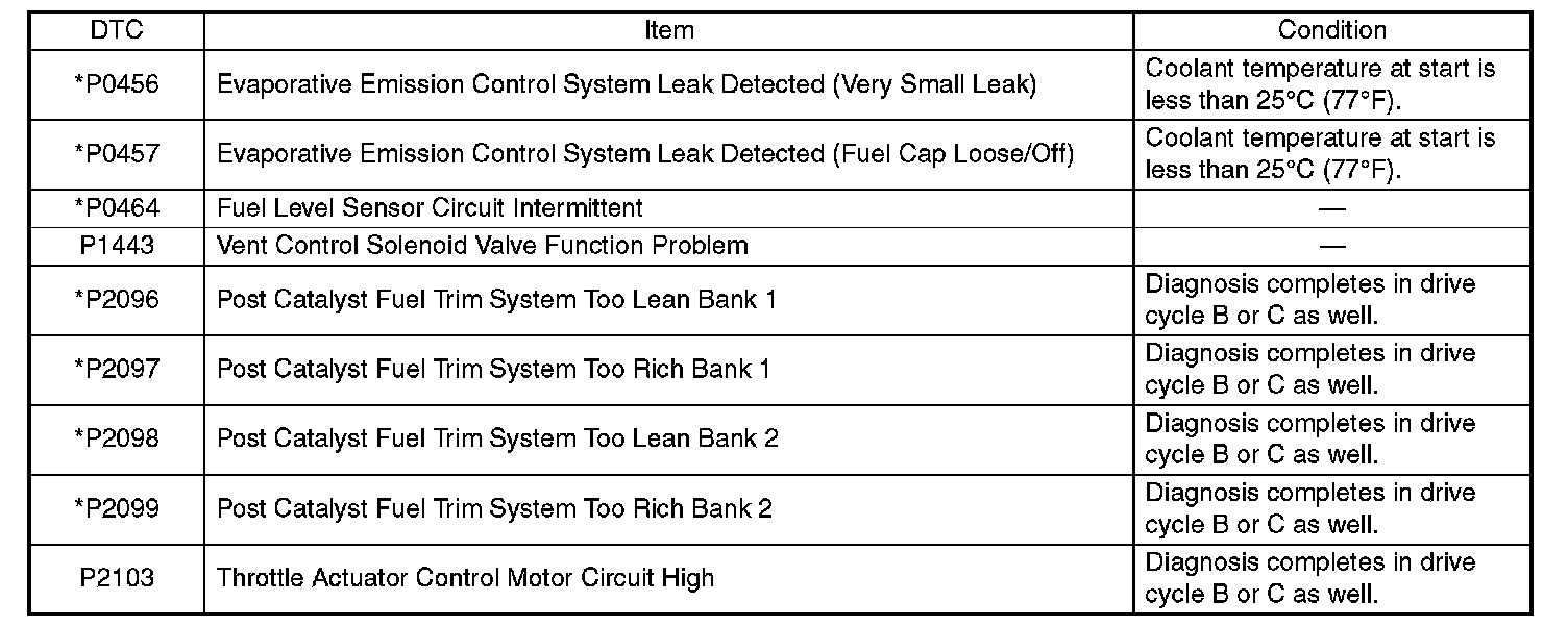 - Carry out the diagnosis which is marked * on DTC twice, then, after finishing first diagnosis, stop the engine and do second time at the same condition.