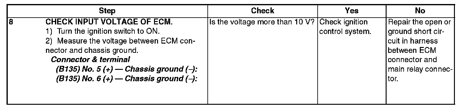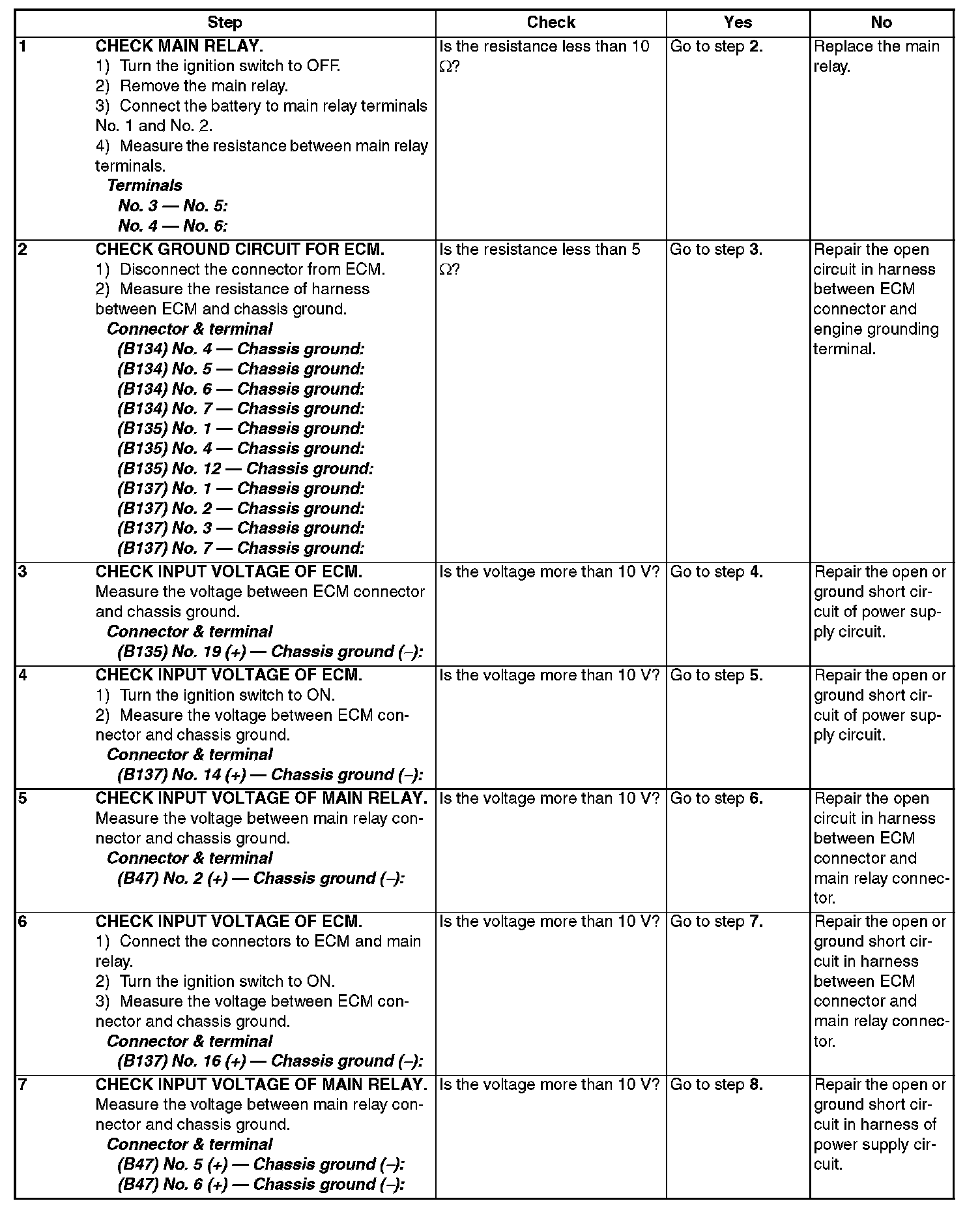 CHECK POWER SUPPLY AND GROUND LINE OF ENGINE CONTROL MODULE (ECM)CAUTION: After repair or replacement of faulty parts, conduct Clear Memory Mode and Inspection Mode.