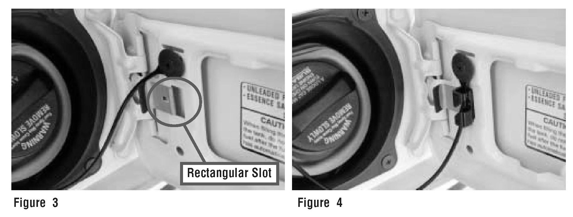 3) Insert fuel cap tether clip into rectangular slot in fuel door (see Figure 3 and 4).
