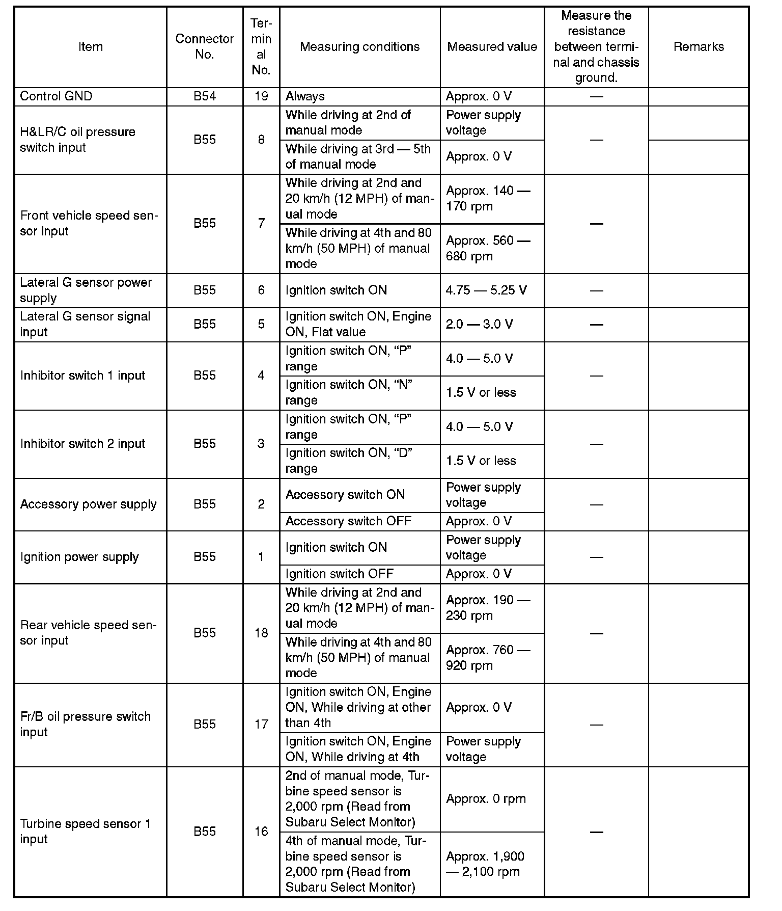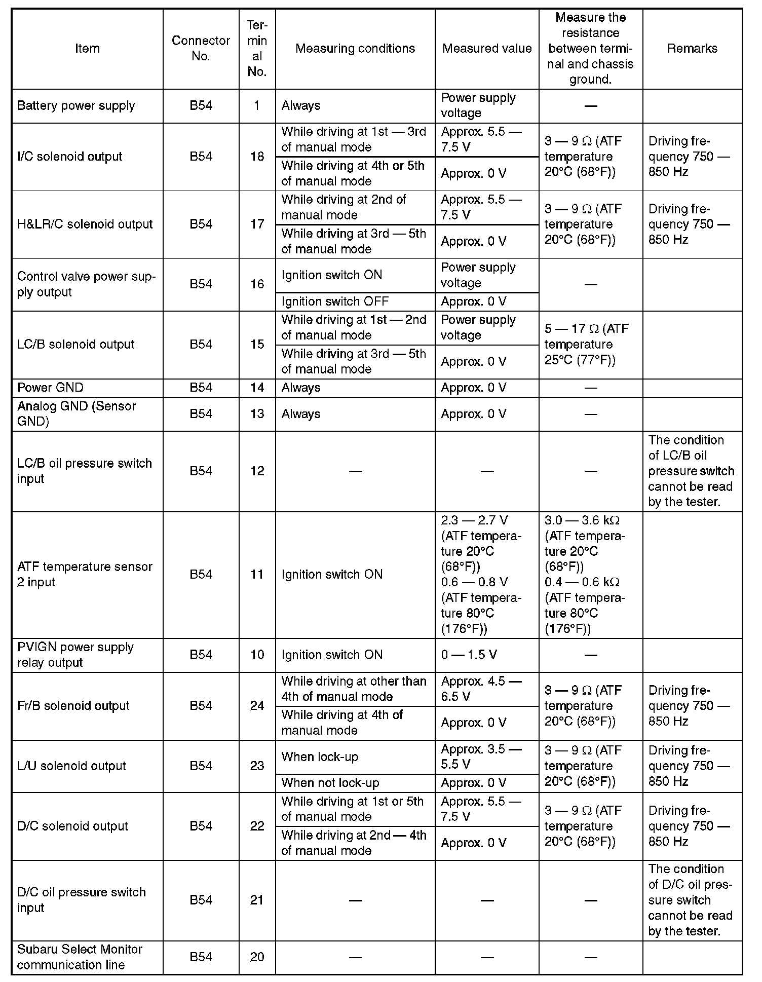 Pinout Values and Diagnostic Parameters
