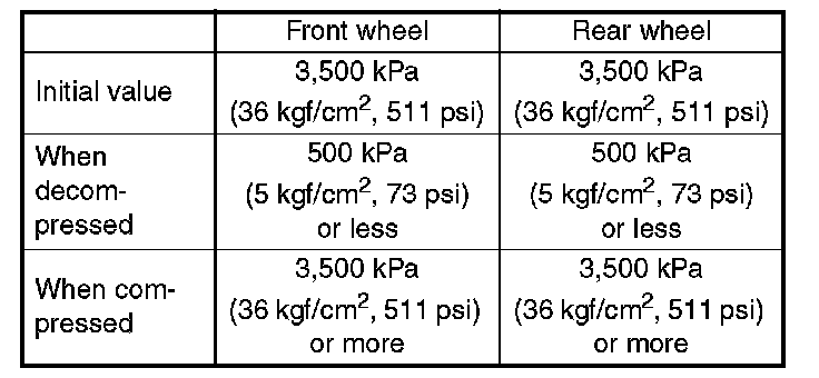 7. Read values indicated on the pressure gauge and check if the fluctuation of the values between decompression and compression meets the standard values. Depress the brake pedal and check that the kick-back is normal, and tightness is normal.