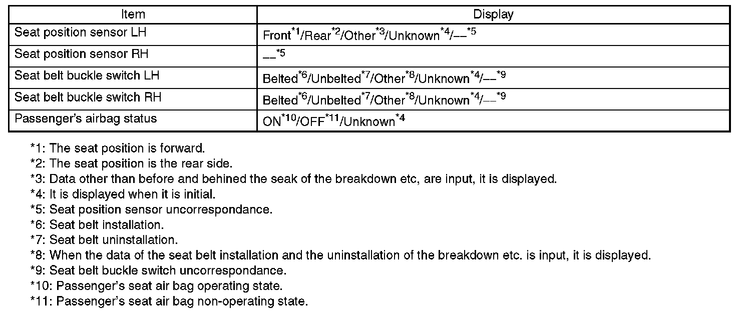 Check the operating condition of each sensor in the event of malfunction in seat belt buckle switch and seat position sensor, or when the seat belt buckle switch and seat position has been replaced.