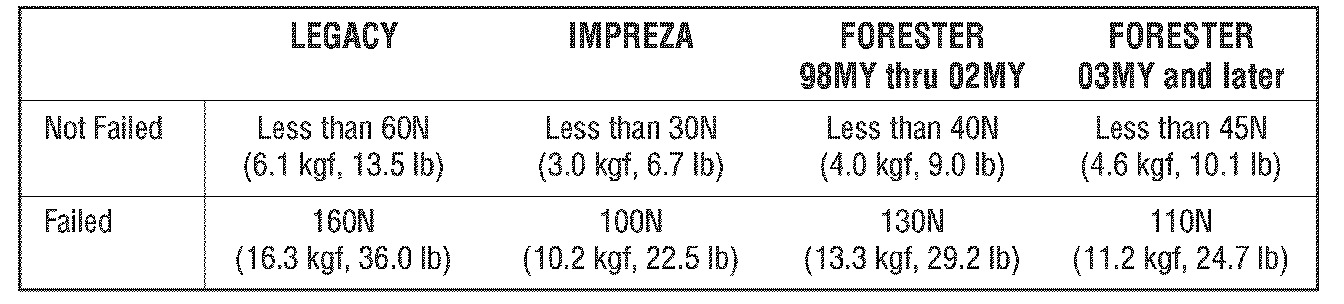 Disconnect one stay (refer to the applicable service manual) at a time. Be sure to zero the needle or gauge on your measuring device before proceeding with any testing. Using the brake pedal effort gauge, measure the load by placing the gauge at the lower edge of the rear gate (see Figure 2). Push up on the rear gate using the gauge and stop when the gate edge is parallel (horizontal) with the rear gate hinge. Record your measurement (see figure 2). Compare your measurements with the ones on the following chart to determine if replacement is necessary. If the measurement is within specification, reinstall the removed stay and remove the opposite one.