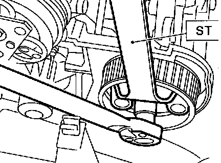 6) Remove the left-hand camshaft sprocket by using ST.