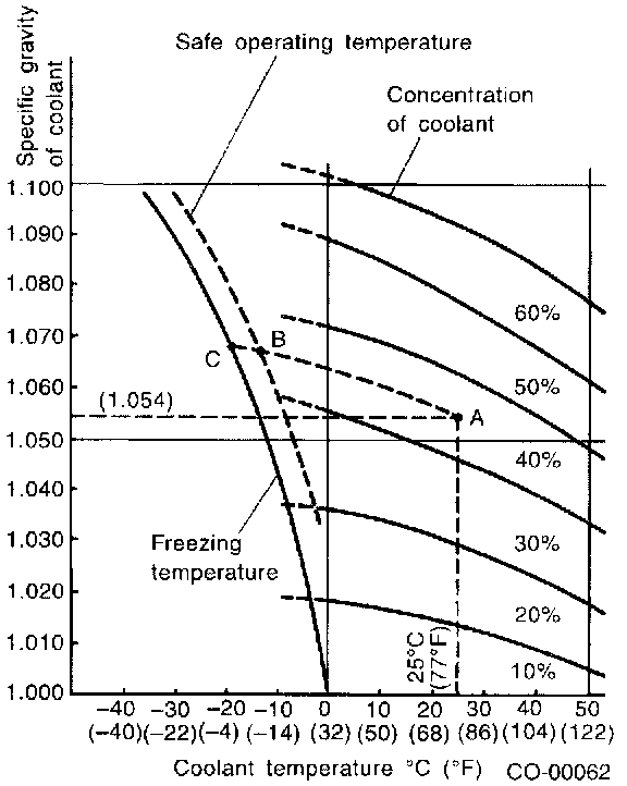 [Example] If the coolant temperature is 25°C (77°F) and its specific gravity is 1.054, the concentration is 45% (point A), the safe operating temperature is -14°C (7°F) (point B), and the freezing temperature is -20°C (-4°F) (point C).