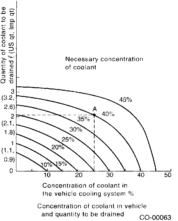 Assume that the coolant concentration must be increased from 25% to 40%. Find point A, where the 25% line of coolant concentration intersects with the 40% curve of the necessary coolant concentration, and read the scale on the vertical axis of the graph at height A. The quantity of coolant to be drained is 2.1 liters (2.2 US quarts 1.8 Imp quarts). Drain 2.1 liters (2.2 US quarts 1.8 Imp quarts) of coolant from the cooling system and add 2.1 liters (2.2 US quarts 1.8 Imp quarts) of the undiluted solution of SUBARU coolant.