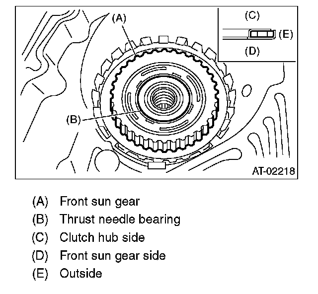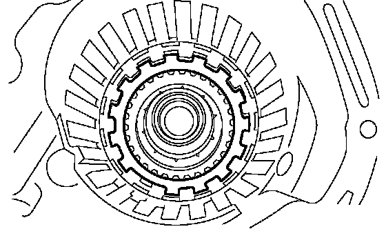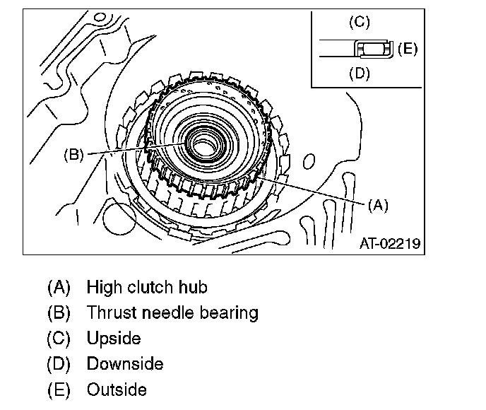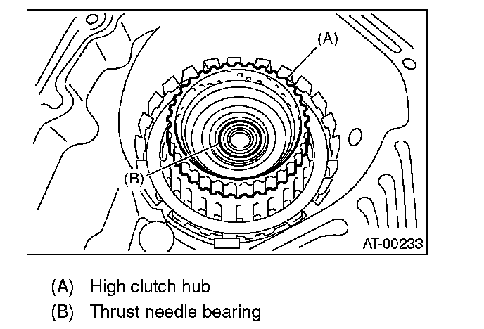 28. Install the high clutch hub. Attach the thrust needle bearing to the hub with vaseline and install the hub by correctly engaging the splines of the front planetary carrier.