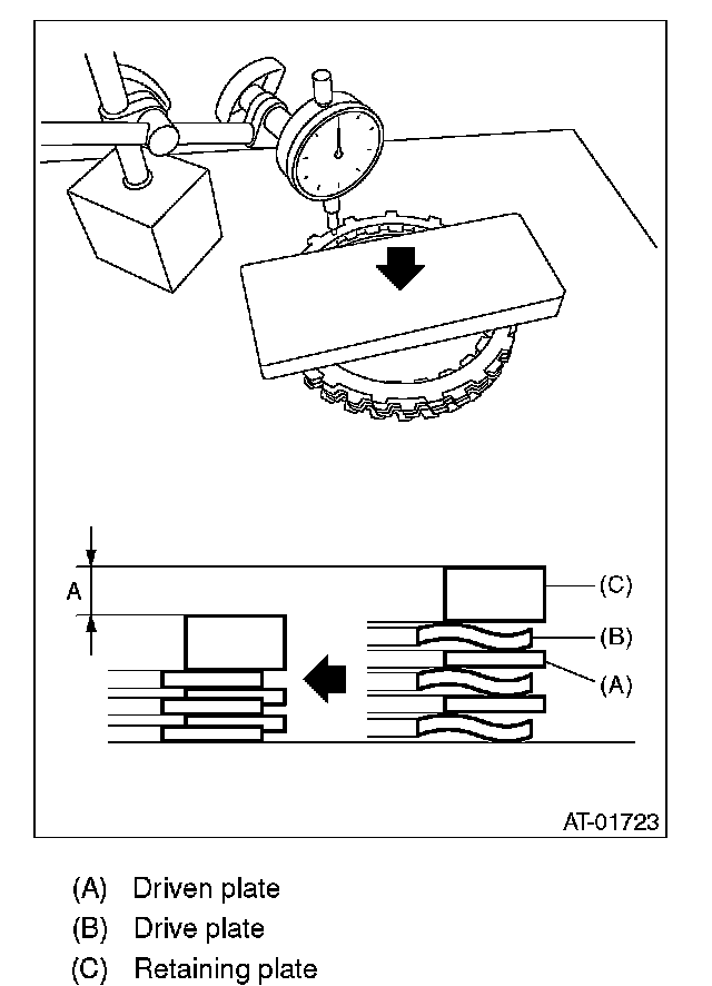 Select the retaining plate within the specification by calculating with A and B dimensions which have been recorded before. If the calculated value exceeds the service limit, replace the drive plate with a new one and adjust it within the specification.