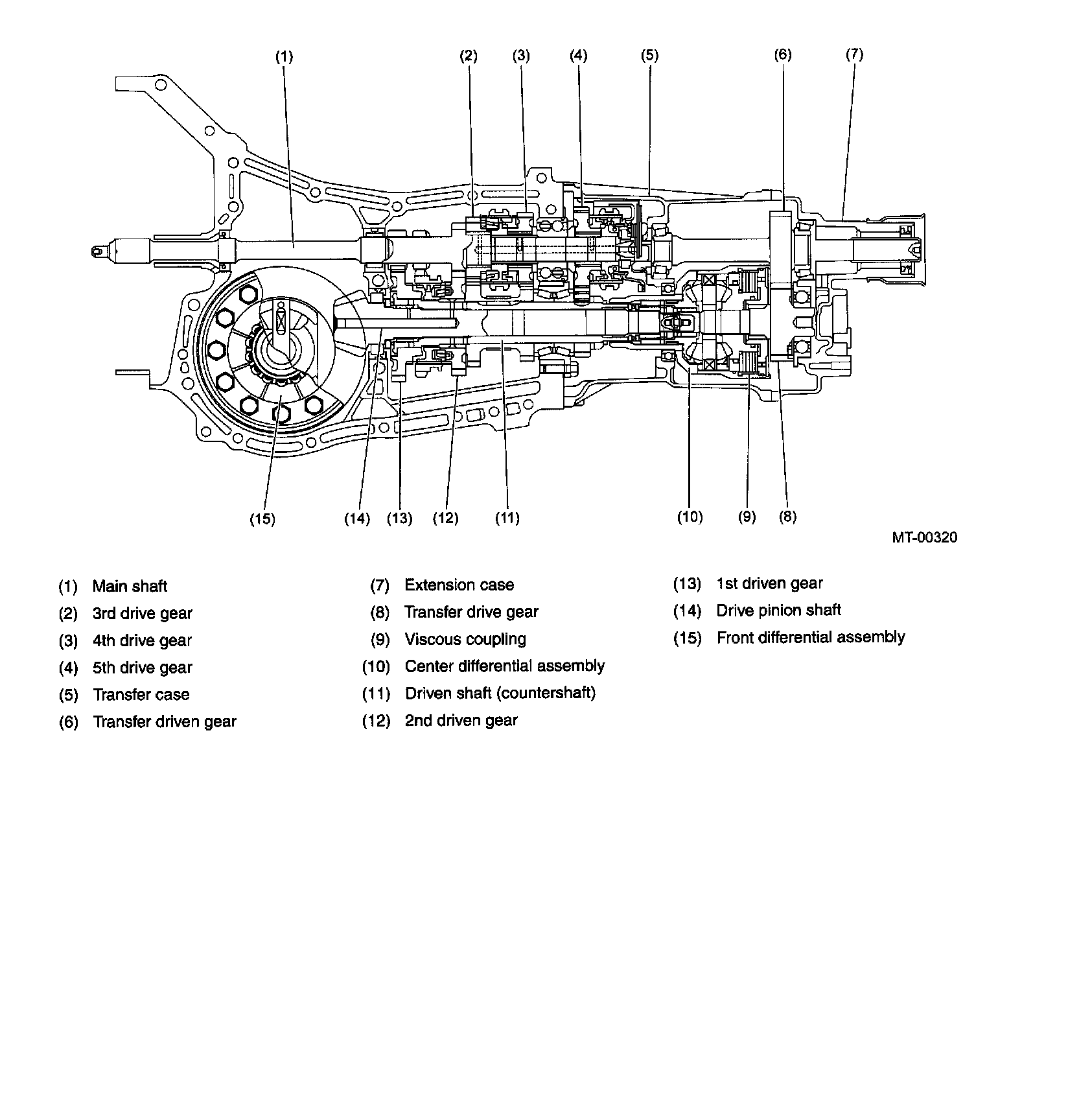 The center differential compensates for the difference in front and rear axle speeds. It consists of a bevel gear set and a viscous coupling located at its rear end which are housed in a single case. The center differential, together with a pair of transfer gears, transmits the power from the transmission to the drive pinion shaft (front wheel drive shaft) and the rear drive shaft. The viscous coupling functions as a differential-action-control element.