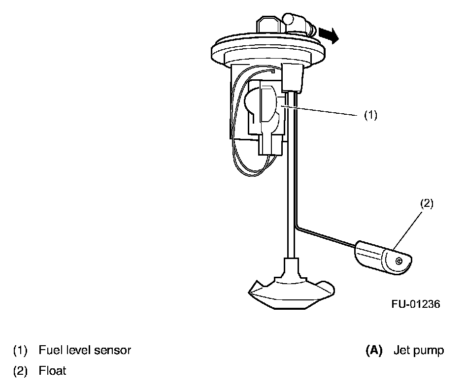 SUB-COMPARTMENT FUEL LEVEL SENSORThis sensor detects the level of the fuel in the sub side (the side without a fuel pump) of the fuel tank. Also, when the jet pump is operating, fuel in the sub side is drawn up and transferred to the fuel pump.
