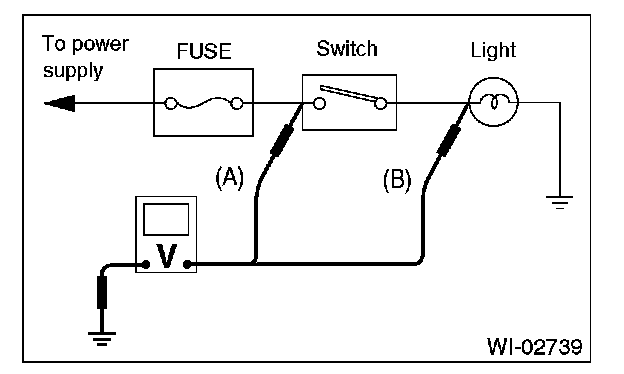 2. Contact the positive lead of the voltmeter on connector (A). The voltmeter will indicate a voltage.