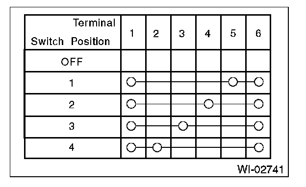 3. The symbol "O--O" indicates that continuity exists between two points or terminals. For example, when a switch position is at "3", continuity exists among terminals 1, 3 and 6, as shown in the table below.