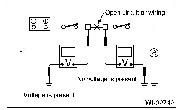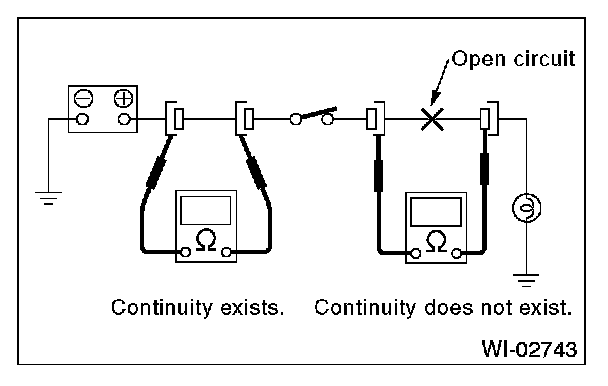 Disconnect all connectors affected, and check continuity in the wiring between adjacent connectors. When the ohmmeter indicates "infinite", the wiring is open.