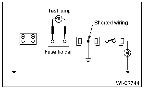 Connect a test light (rated at approx. 3 watts) in place of the blown fuse and allow current to flow through the circuit. Disconnect one connector at a time from the circuit. Starting with the one located farthest from the power supply. If the test light goes out when a connector is disconnected, the wiring between that connector and the next connector (farther from the power supply) is shorted.