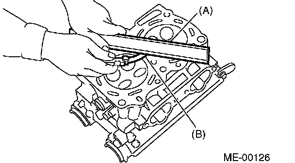 2. Measure the warping of the cylinder head surface that mates with crankcase by using a straight edge (A) and thickness gauge (B).