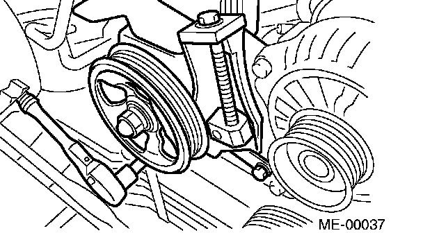 NOTE: Be careful not to damage adjacent parts or body panels with crank pulley, oil pressure gauge, etc.
