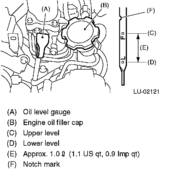 6. Just after driving or while the engine is warm, engine oil level may show in the range between the "F" line and notch mark. This is caused by thermal expansion of engine oil.