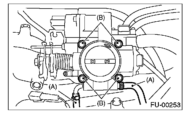 8. Remove bolts (B) which install throttle body to intake manifold.